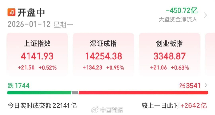 1月12日,A股三大指数集体上涨。截至发稿,上证指数涨0.52%,深证成指涨0.95%,创业板指涨0.63%。商业航天、AI应用、贵金属等板块指数涨幅居前,水产、铜箔/覆铜板、石油石化等板块指数跌幅居前。