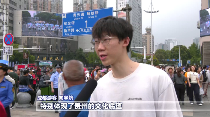 成都游客 向宇航:感觉特别震撼,体现了贵州的文化底蕴,综合性很强,有年轻的活力,也融合了一些比较古老的记忆以及传统。贵阳这个城市的美食真的特别好吃,我建议大家都来贵阳多吃吃美食。