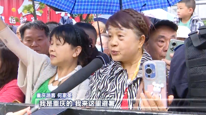 重庆游客 何家英:我是重庆的,我来这里避暑,我们今天就跑过来看你们的舞蹈,感觉到很好、很漂亮,比如说贵州的衣服也很漂亮,服装各方面都很好。