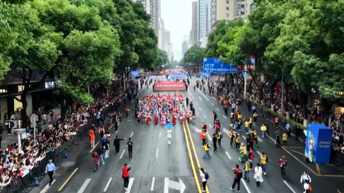 上午9点,动感激昂的音乐声穿透晨曦,一条流动的“民族彩绸”从中华北路蜿蜒而出。3600名演职人员组成的26个方阵,身着绚丽的民族服饰,踏着欢快的节拍,将非遗文化的千年魅力化作欢腾的舞步,绘就一幅各民族团结奋进的动人画卷。沿途早早站满了市民游客,巡游队伍经过时,大家纷纷拿出手中的相机、手机,用镜头定格眼前震撼壮观的景象。