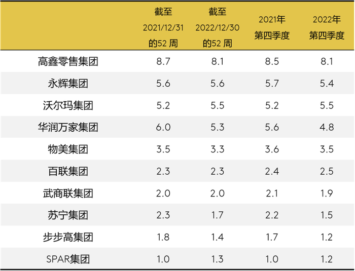 数据来源:凯度消费者指数●线下渠道的整体疲软也使得竞争进一步白热化,中国头部零售商的集中度也进一步降低。四季度高鑫零售、永辉、华润万家市场份额均有明显下降。