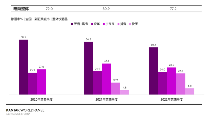 ●凯度消费者指数的最新数据显示了2022年整体电商渠道增速减缓,但消费者的购买频次保持稳定,而兴趣电商在这一年飞速增长。