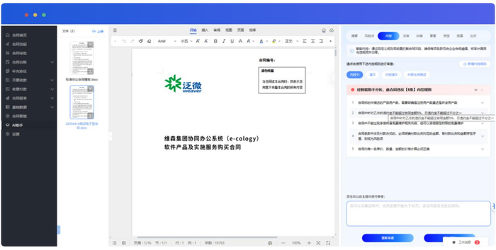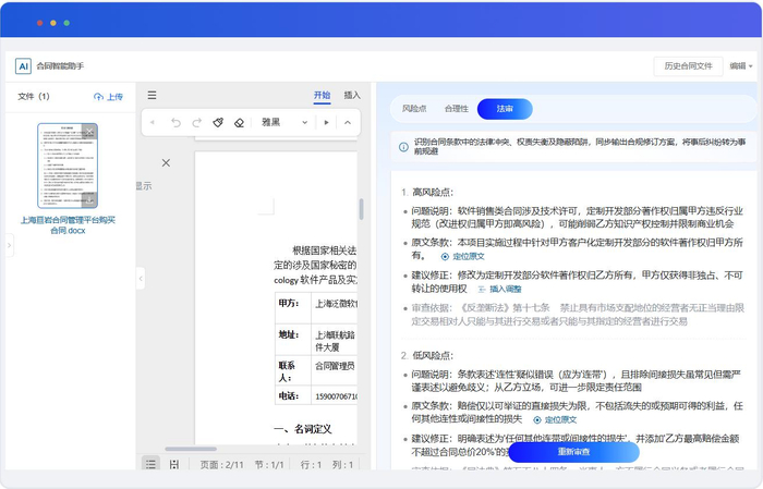 · 法务审核:通过AI自动识别合同中的关键条款,如质保金比例、惩罚条款等,对照法规与内控要求进行合规性审查与提示。
