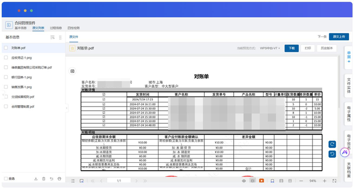 合同过程中,签署的合同、结算的凭证、开具的发票,自动采集、动态更新,全量归集到合同档案,确保档案内容始终与业务、财务同步。