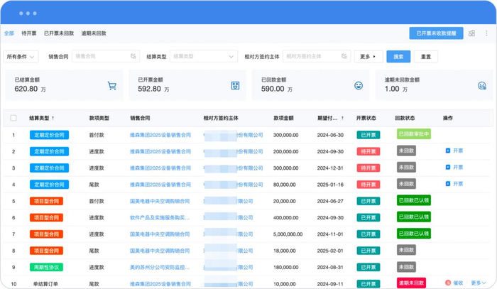 通过自动关联合同、发票、收付款数据,能够实时监控履约进度、资金流水和税务合规。销售人员可以很方便地看到哪些合同已经开票、哪些已经到款和自己的业绩情况;财务主管可以清晰查看收款/付款计划执行得如何、哪些发票已经开出;业务主管可以马上锁定延期项目,找出问题进行解决。