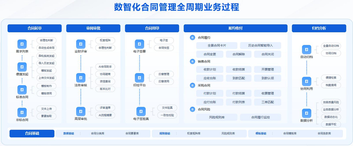 现在,随着业务的发展与合规要求提升,合同串联了业务成果与财务收付、票税、核算等内容,合同与业务、财务的协同直接影响资金安全和风控能力。因此,要整体建设好一体化数智业财融合体系,必须要先把合同管理真正数智化。