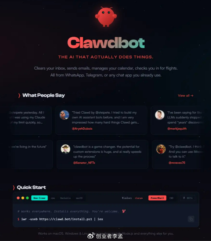如果说 AI PC 是 “让电脑更聪明地响应你”,普通 AI 是 “让电脑陪你聊天”,那 Clawdbot 就是 “让电脑替你干活”。它的出现,终于把 AI 从 “语言交互” 推向了 “实际行动”,对于每天被机械操作占据大量时间的打工人来说,这可能是继鼠标键盘之后,电脑操作方式的又一次革命。对此大家是怎么看的,欢迎关注我“创业者李孟”和我一起交流!