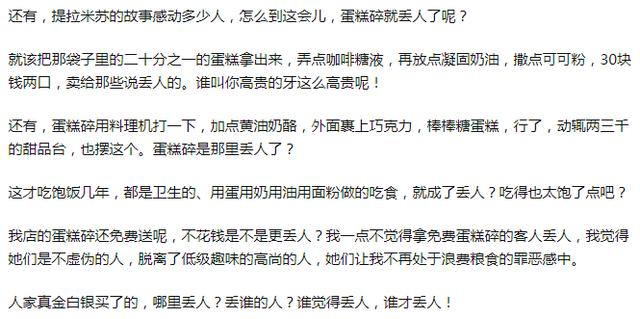 再说,如果这位宝妈一边买着蛋糕边角料,一边对着孩子说“我们家穷,没钱给你买蛋糕,你们就吃蛋糕边角料吧”,甚至小小声嘱咐“吃便宜的蛋糕边角料丢人,别告诉同学”,那没准会养出自卑的孩子。