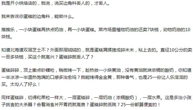 Ps:其实,有些很贵的蛋糕就是边角料做的呀~某乎网友开了家小烘焙店,给我们分享了蛋糕的边角料都能做什么: