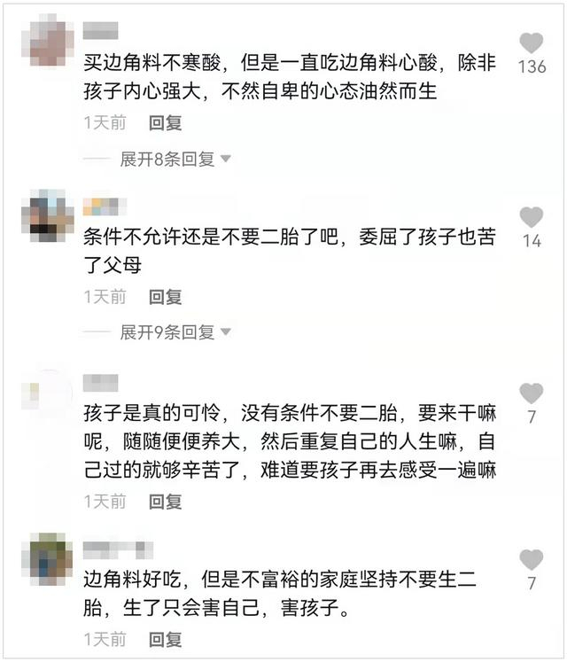 事情很简单,源于一位二胎全职宝妈的分享。因为家庭收入全靠宝爸一人扛,生活压力不小,但再省不能省了孩子的零食,便买了蛋糕的边角料。对此,孩子超很开心,但一些网友们的评论很不友好!