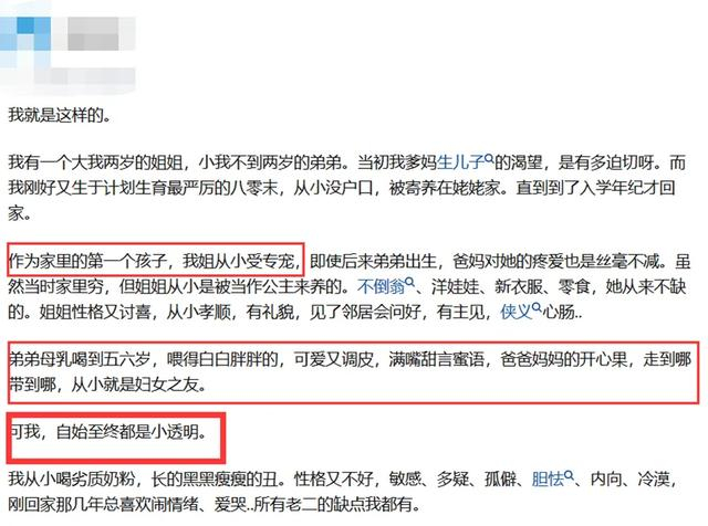 有人说:“姐姐作为家里的第一个孩子,从小受专宠;弟弟母乳喝到5、6岁,是爸爸妈妈的开心果;而自己从始至终都是家里的小透明,既又不受宠,也不优秀。”