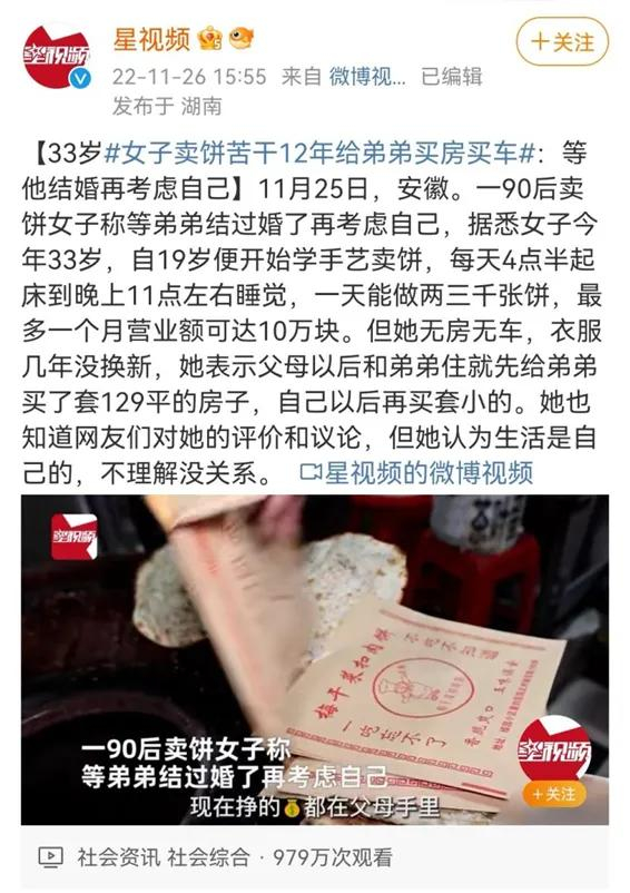 就像前段时间,老育在网上看到一个新闻,一个90后女子从19岁便开始学手艺卖饼,至今苦干12年,每天起早贪黑地卖饼,只为给弟弟买房买车,而自己的人生,则要等弟弟结婚后再考虑。