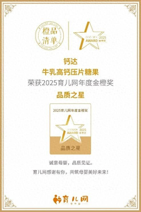 近日,2025年育儿网“橙品清单·妈妈口碑之选”评选结果正式揭晓。专业钙营养品牌钙达旗下的的明星产品——钙达®牛乳高钙压片糖果,凭借其100%天然钙源、科学助吸收的纯净配方,以及“好营养敢透明、自建工厂保品质”的核心优势,荣获2025年度“金橙奖·品质之星”,赢得了专业评审团与广大母婴用户共同赋予的品质信赖。