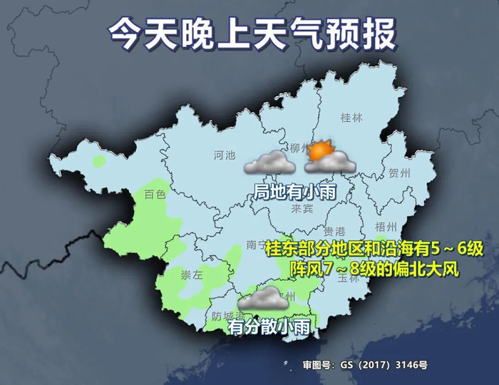 今天晚上,百色、崇左、南宁、防城港、钦州、北海等市阴天有分散小雨,其它地区阴天间多云、局地有小雨。
