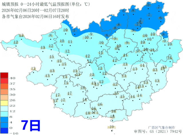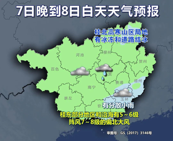7日晚上到8日白天,桂北、桂西阴天有小雨,其它地区阴天有分散小雨。桂北高寒山区局地有冰冻和道路结冰。最低气温:高寒山区-3~3℃,桂东北4~8℃,其它地区8~12℃。