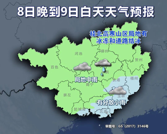 8日晚上到9日白天,桂北、桂西阴天小雨、局地中雨,其它地区阴天有分散小雨。桂北高寒山区局地有冰冻和道路结冰。最低气温:高寒山区-1~4℃,桂东北5~8℃,其它地区8~14℃。