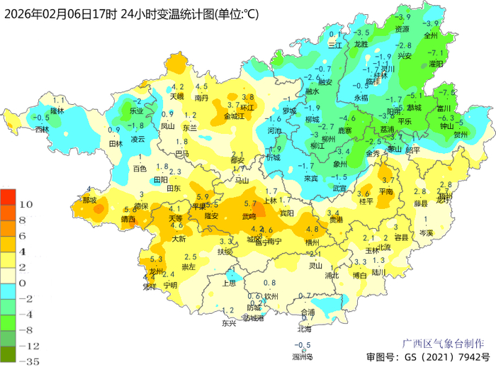 7-8日,受较强冷空气影响,各地日平均气温下降6~8℃、局地10℃以上,桂东部分地区和沿海有5~6级、阵风7~8级的偏北大风。