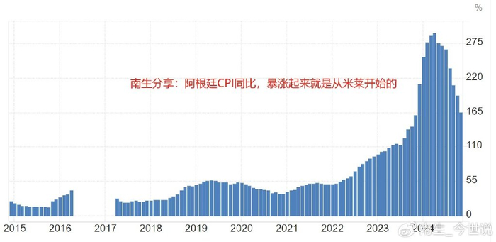 上为米莱前任时期的CPI涨幅,2014年以来的大多数时间内都在50%附近波动,但在米莱上台后,很快就突破了200%,高峰时期接近300%。就这样的通胀率,西方媒体还将之包装成政绩呢。