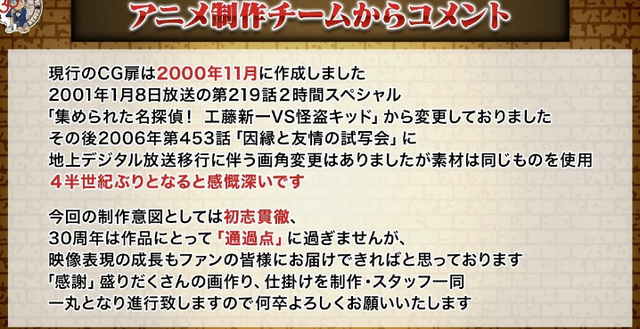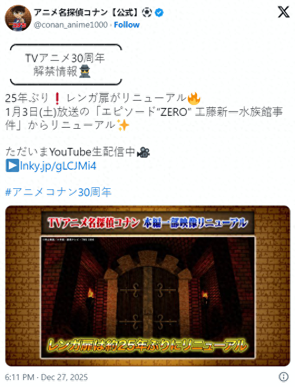 而就在今天,官方在 YouTube 频道的「动画三十周年年末情报公开」节目中,说道《名侦探柯南》那道陪了大家二十五年的“砖墙门”,要更新了。