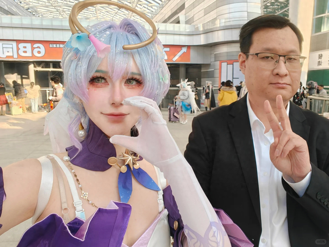 照片里,一位穿着朴素、气质过于“体制内”的中年男性,站在一堆年轻 Coser 中间,神态自然,眼神稳重,怎么看像是来视察的领导。