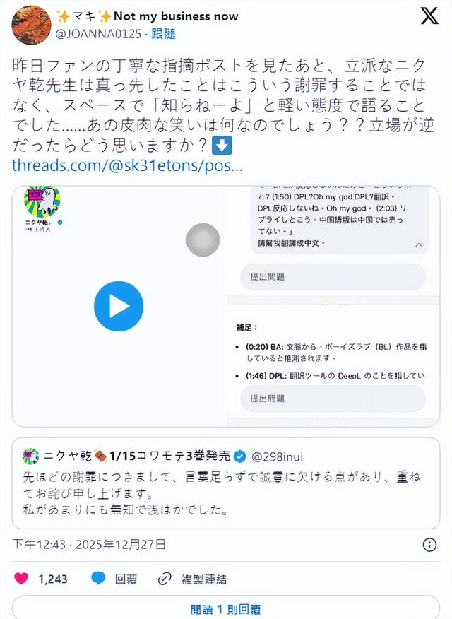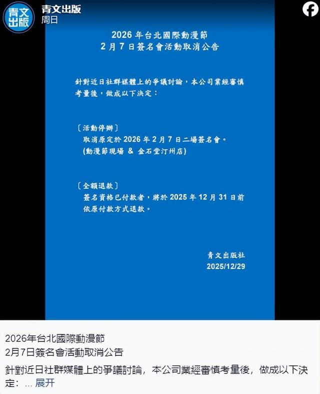 但网络风暴从来不讲“理解成本”,原定于 2 月 7 日 在台湾举办的两场签名会,最终由 青文出版社 于 12 月 29 日正式宣布取消。