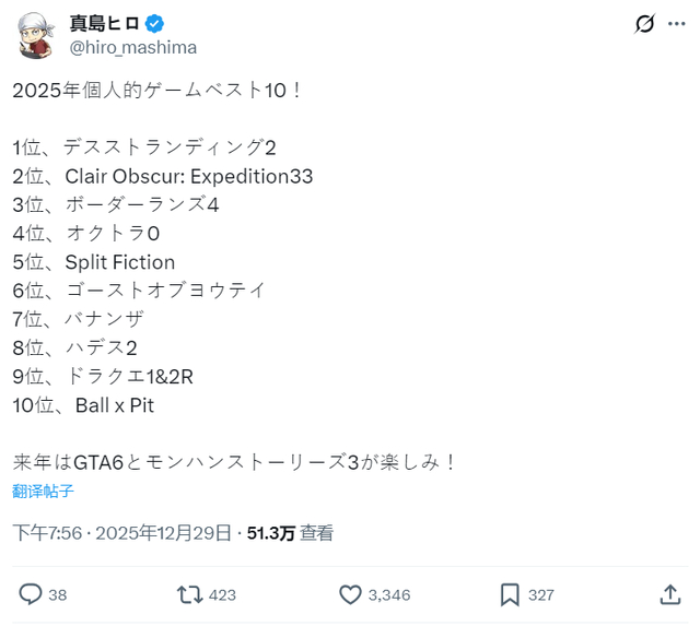 近日,真岛浩在个人 X(原 Twitter)账号上,公开了他从今年年初到现在,亲自游玩后评选的「年度最佳游戏 TOP10」。