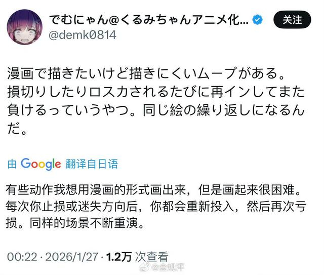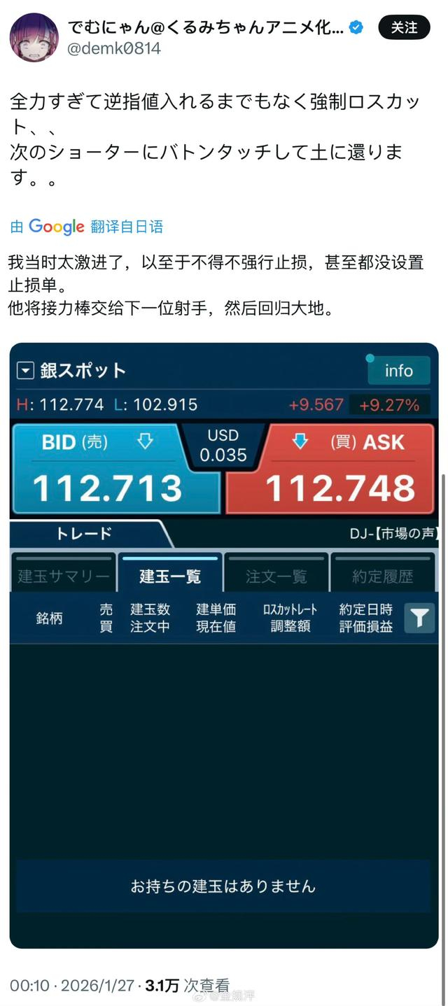 就在 1 月 27 日晚上,《FX战士久留美》的原作者 でむにゃん 在社交平台上,几乎是同步直播了自己的一次操作结局:做空白银。20 分钟内。直接爆仓。