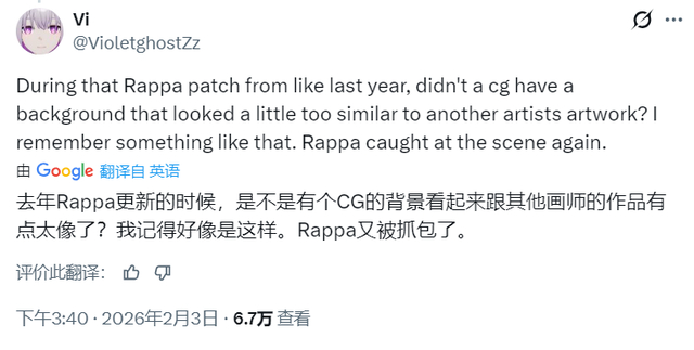 有一位日本画师在 X(原推特)上发帖表示:2026年2月3号的PV 里有一个镜头,跟他在2025年 1月24号发在X上的一张二创图“有点相似”。