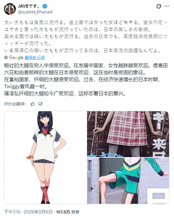 最近,日本网友围绕一个看起来很“二次元”、但实际很“社会学”的话题吵了起来,“现在流行白幼瘦,说明社会进步了;以前流行肉腿,其实是贫穷的象征?”
