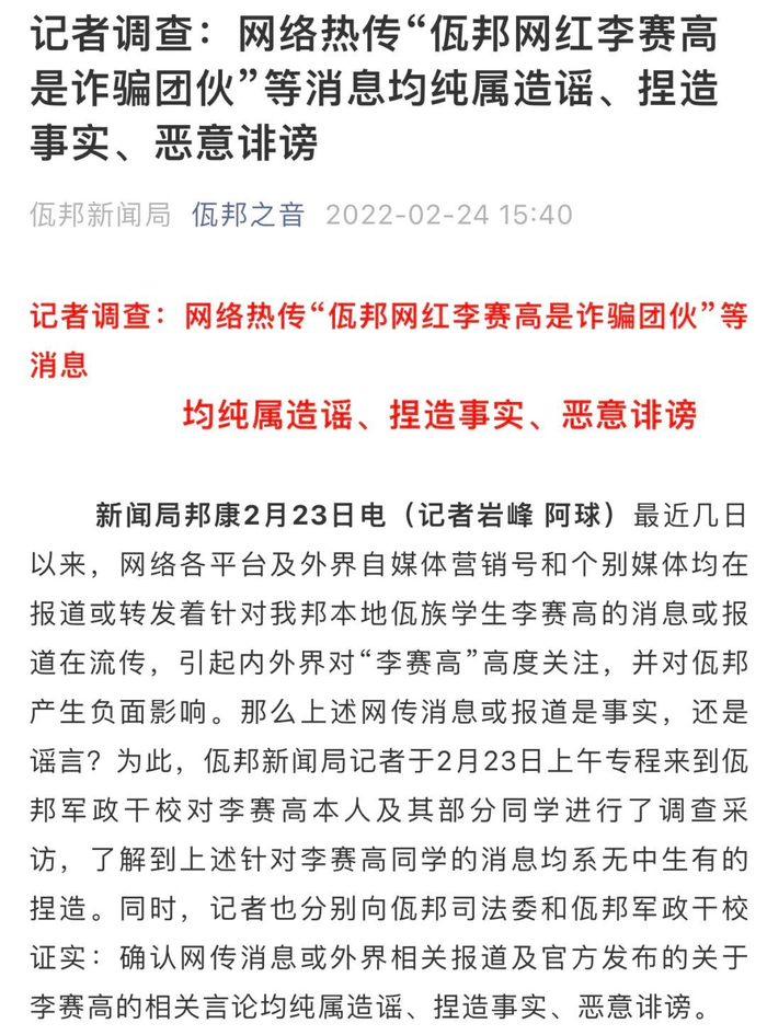 今日下午,佤邦新闻局官方公众号“佤邦之音”发布声明称,分别向佤邦司法委和佤邦军政干校证实:确认网传消息或外界相关报道及官方发布的关于李赛高的相关言论均纯属造谣、捏造事实、恶意诽谤。佤邦新闻局称,2月23日上午专程来到佤邦军政干校,对李赛高本人及其部分同学进行了调查采访,了解到李赛高作品内容均为李赛高本人和同学们的学习之余出于个人爱好,利用课余时间录制音乐视频与其粉丝们分享的内容。 佤邦军政干校方面也出具了“李赛高事件”的证明。证明称,李赛高于2020年7月25日进入该校学习至今,勤奋好学,遵纪守法,无任何不良行为。该生只是一个喜欢吉他弹唱,热爱音乐的普通学生,平时会在短视频平台分享正能量音乐视频。该生与亨利集团无任何关系。