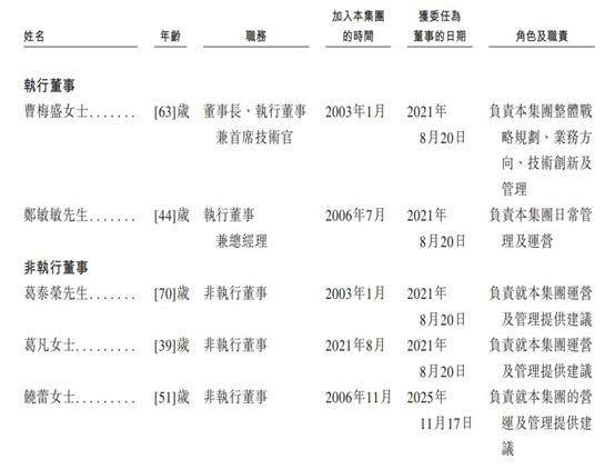 招股书披露的信息显示,浙江荣泰董事会由九名董事组成,包括两名执行董事、三名非执行董事及四名独立非执行董事。曹梅盛女士任董事长、执行董事兼首席技术官,负责集团整体战略规划,郑敏敏先生任公司执行董事兼总经理,负责集团日常管理及运营,葛泰荣先生任非执行董事。