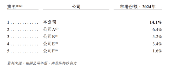 根据弗若斯特沙利文的统计资料,在中国新能源领域云母产品市场中,呈现出较为分散的竞争情况,公司占据主导地位,在2024年按收入排名位列第一,市场份额占比为14.1%,排名二至五位的其他公司份额距离浙江荣泰还有较大差距。以下为2024年中国新能源领域云母产品市场按收入排名情况:
