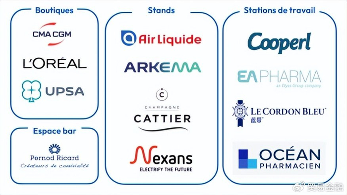 除参展商外,另有27家法国企业及一个大区将其品牌形象与法国国家馆紧密关联: