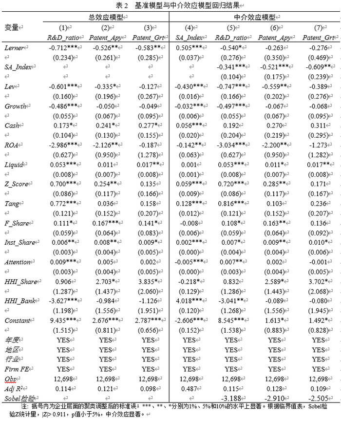 进一步分析银行价格竞争影响企业研发投资活动的融资约束中介效应机制。银行价格竞争可能通过缓解企业外源融资约束来促进企业创新。依据中介效应检验逻辑,通过逐步检验回归系数来识别融资约束的中介效应。首先,使用固定效应估计模型(2),表2第4列展示了回归结果,银行价格竞争对反映企业融资约束的SA指数回归系数约为0.51,且在1%的水平上显著为正,表明银行价格竞争程度上升促进了SA指数的提升,即缓解了企业的融资约束。