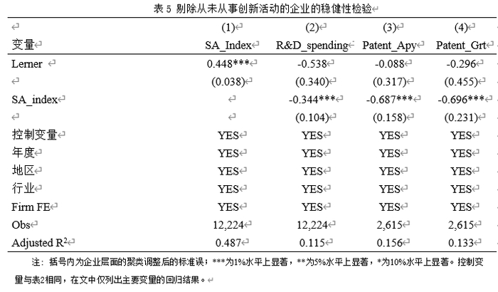 随后,估计模型(3),表2的第5-7列分别展示了引入中介变量SA指数之后,Lerner指数对企业研发强度、专利申请量和授权量的固定效应回归结果。在研发投入方面,SA指数对研发强度的回归系数为-0.34且在1%的水平上显著,表示融资约束的缓解能够显著地促进企业研发投入。同时在控制融资约束之后,Lerner指数对研发强度的回归系数显著为-0.540,低于表3的第1列回归系数-0.71,表明银行价格竞争通过融资约束来影响企业研发投入的间接传导途径存在,此中介效应的影响系数约为-0.17(-0.34*0.51),解释力约为24.1%(-0.17/-0.71)。在研发产出方面,SA指数对专利申请量和专利授权量的回归系数分别为-0.52和-0.61,且分别在1%和5%的水平上显著,表明融资约束同样能够显著地促进企业研发产出。值得注意的是,在控制融资约束之后,专利申请量、授权量对Lerner指数的敏感性在90%的置信水平上不能拒绝系数为零,表明银行价格竞争主要是通过缓解企业融资约束的渠道来促进创新产出,其中介效应的影响系数分别约为-0.26和0.31,解释力约为50%和52.7%。此外,为了更为精确地判断融资约束的中介效应,本文还进行了Sobel检验,检验统计量Z值在1%的水平上显著,与逐步检验回归系数法结论一致。可见,上述的经验研究证据不能拒绝本文提出的研究假设H1。