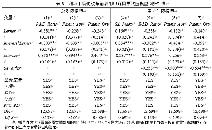 表8报告了利率市场化改革对于银行价格竞争对企业研发投资活动影响的回归结果。在第1-3列中,利率市场化与银行价格竞争的交叉项Interest*Lerner的回归系数分别为-0.39、-0.64和-0.60,且在10%的水平上显著,表明利率市场化加强了银行价格竞争对企业研发投入和产出的促进效应。第4列显示Interest*Lerner回归系数显著为正,说明利率市场化强化了银行价格竞争对企业融资约束的缓解效应。从第5-7列的中介效应回归结果可以看出,在研发投入方面,SA指数对研发强度的回归系数为0.26,且在1%的水平上显著,同时Lerner指数与Interest*Lerner的回归系数绝对值减小,表明利率市场化强化银行价格竞争,并通过融资约束来影响企业研发投入的间接传导途径存在。在研发产出方面,SA指数对专利申请量和专利授权量的回归系数分别为-0.58和-0.59,且在1%的水平上显著。同时Lerner指数、利率市场化与Lerner指数交叉项对专利申请量、授权量的回归系数在90%的置信水平上不能拒绝系数为零,表明利率市场化加强银行价格竞争,并主要通过缓解企业融资约束来促进企业创新。可见,上述的经验研究证据不能拒绝本文提出的研究假设H2。