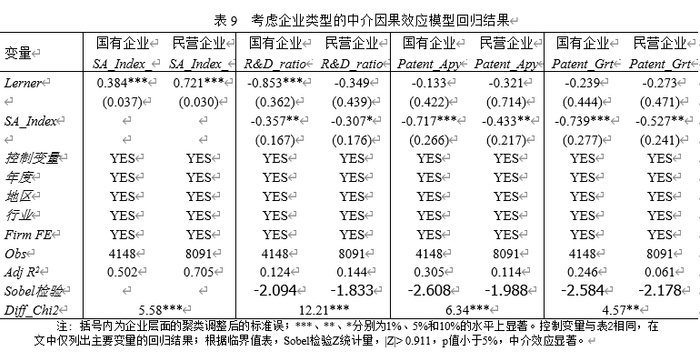 本文按照企业登记注册类型,将样本分为国有企业和非国有企业,考察这两组样本中,银行价格竞争促进企业研发投资活动的融资约束中介效应是否存在差异,估计结果如表9所示。Lerner指数对民营企业SA指数的回归系数为-0. 72,绝对值明显大于国有企业的-0.38,且二者在1%的水平上都显著。这表明尽管银行价格竞争不同程度地对国有企业和民营企业的融资约束均产生显著地缓解作用,但给民营企业所带来的融资约束缓解效应更大。此外,SA指数对国有企业、民营企业的研发强度、专利申请量和授权量的回归系数均显著为负,且对国有企业的影响效应显著大于民营企业,说明国有企业将资金配置于从事企业创新的意愿相对更强。但由于银行价格竞争对民营企业融资约束的缓解效应更大,银行价格竞争通过融资约束缓解对研发强度、专利申请和授权的影响效应在民营企业样本中分别约为-0.22(-0.31*0.72)、-0.32(-0.44*0.72)和-0.38(-0.53*0.72),绝对值大于国有企业的-0.14(-0.36*0.38)、-0.28(-0.72*0.38)和-0.28(-0.74*0.38),表明当银行价格竞争程度增加时,民营企业融资约束缓解对企业创新的促进效应大于国有企业。可见,上述的经验证据不能拒绝研究假设H3。