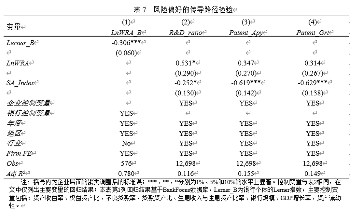 为了考察银行价格竞争是否增加银行风险偏好,进而促进企业研发投资活动。本文参考刘冲等(2019),选取商业银行风险加权资产规模衡量银行风险偏好,估计银行层面的价格竞争度Lerner_B,即公式(4)中的Lernerj.t,对风险加权资产规模自然对数的影响。表5的第1列显示,Lerner_B对LnWRA_B的回归系数为-0.31,且在1%的水平上显著,银行垄断能力的下降显著增加了银行对风险资产配置的偏好。随后估计了地区平均银行风险加权资产的自然对数LnWRA对企业研发投资活动影响,结果见表7的第2-4列。可以发现,在控制融资约束之后,LnWRA对企业研发投入的回归系数显著为正,但对研发产出的影响不显著,说明银行价格竞争对企业研发投入影响的风险偏好路径存在。这一结论验证了补充假设H1c。