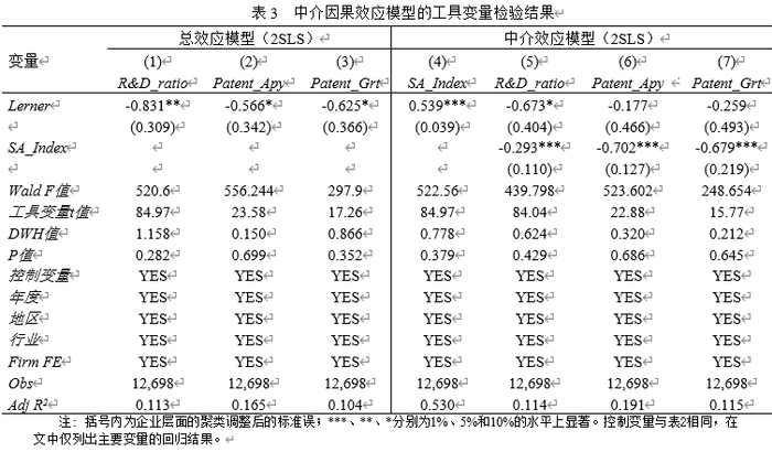 表3的第1-3列为银行价格竞争对企业研发强度、专利申请和授权量影响的总效应2SLS估计结果,Lerner指数的回归系数显著为负,表明银行价格竞争对企业研发投资活动的促进效应存在。表3的第4-7列为中介效应2SLS的估计结果。从第4列可以看出,Lerner指数对SA指数的估计系数为正且在1%的水平上显著,表明银行价格竞争对企业融资约束具有缓解效应。在第5-7列显示,SA指数对企业研发强度的回归系数显著为负,且Lerner指数对研发强度的影响效应有所减弱,说明融资约束作为中介途径间接影响银行价格竞争对企业研发投入促进效应的路径存在。在研发产出方面,SA指数对专利申请量和专利授权量的回归系数均显著为负,但在10%的水平上不能拒绝为零,表明银行价格竞争促进企业研发产出主要是通过缓解融资约束渠道来实现。可见,在考虑内生性问题之后仍然得到与基准回归一致的结论,不能拒绝研究假设H1。此外,表3中工具变量回归的Wald F检验的F值大于10,且一阶段工具变量t值均能在90%的置信区间内通过显著性检验,拒绝了弱工具变量的假设。而且DWH检验结果在10%水平上未能表现出显著性,不能拒绝IV估计量与基准模型估计量不存在系统性差异的假设。