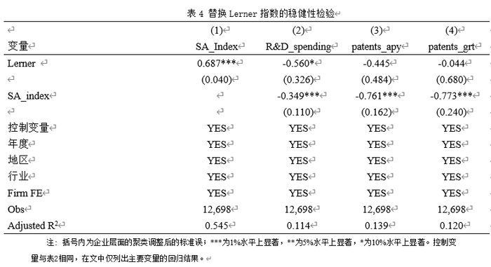上述分析结果表明Lerner指数通过缓解融资约束进而促进企业创新。然而,地级市层面经效率调整的Lerner指数作为核心解释变量度量银行价格竞争,可能会因为超越对数函数的设定不同造成估算结果差异,对实证结果的稳健性产生影响。我们将公式(5)中加入trend变量分别与三种投入、三种产出交叉项,得到更一般形式的超越成本函数的表达式估算Lerner指数,并重新估计中介效应模型,回归结果如表4所示。重估的地级市经效率调整Lerner指数之后,银行价格竞争对企业创新强度、创新产出的影响仍然可以通过缓解融资约束这一中介效应实现,这与前文的结论一致。