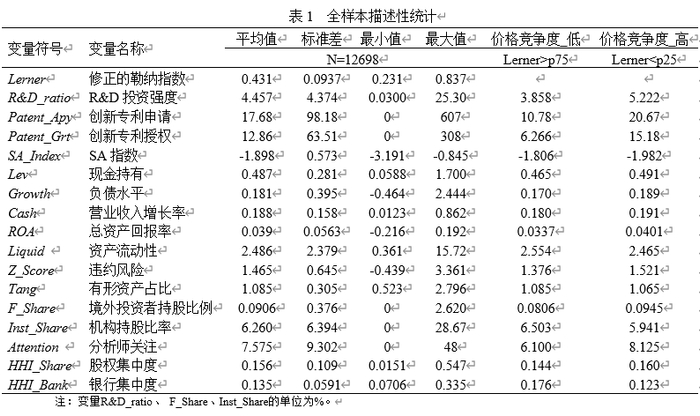 本文的边际贡献主要体现为:第一,在研究范畴上,基于银行业市场集中度与价格竞争度存在实质性差异这一事实,关注银行价格竞争对企业研发投资活动的影响,并识别出反映银行风险偏好调整的直接“风险效应”,以及企业融资约束间接作用机制的“价格效应”和“数量效应”,有助于学术界和政策层更好地认识银行业竞争与实体经济发展之间的关系。第二,在研究方法上,采用“中介效应”模型,识别银行价格竞争对企业创新的融资约束中介效应,同时构建地级市层面的银行业经效率调整的Lerner指数作为银行价格竞争的测度,为准确评估利率市场化进程中银行竞争环境对企业研发投资活动的影响效应提供经验证据。第三,在政策上,基于中国利率市场化改革快速推进的现实背景,利用2015年10月24日存款利率放开、利率市场化在形式上基本完成这一外生事件,检验了银行价格竞争在不同利率市场化阶段对企业研发投资的影响,为推进利率市场化改革,合理引导银行信贷资金配置以推动实体经济创新活力提供政策启示。
