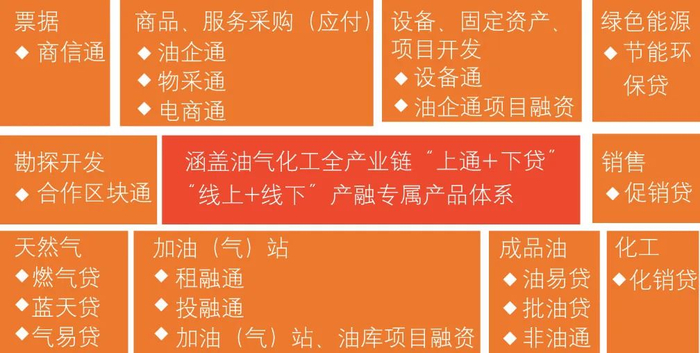开发全链条供应链金融产品体系。针对上游供应商、服务商、承包商企业,昆仑银行开发出基于商业承兑汇票的“商信通”,基于订单、合同、工程量和应收账款的“油企通”“物采通”“租融通”,基于加油站(加气站)租赁业务的“租融通”,基于合资建设油气储备库等基础实施的“投融通”等系列产品;针对下游经销商、直供用户、电商平台、零售终端企业,昆仑银行开发出基于燃气用户的“燃气贷”,基于销售商的“促销贷”“油易贷”,基于电商平台的“商保贷”等产品(见图2)。