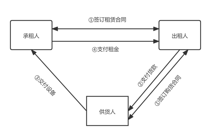 融资租赁是国际上最普遍、最基本的非银行金融形式。它通常的交易模式表现为出租人根据承租人(用户)的请求,与第三方(供货商)订立供货合同,根据此合同,出租人出资向供货商购买承租人选定的设备。同时,出租人与承租人订立一项租赁合同,将设备出租给承租人,并向承租人收取一定的租金。