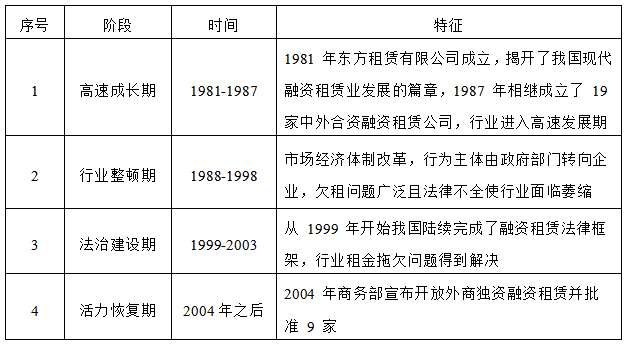 融资租赁业务在我国的发展始于20世纪80年代初期,并经历了行业初创、高速发展、整顿修正及步入正轨的发展道路,有关学者也将其发展进程归纳如下表所示。
