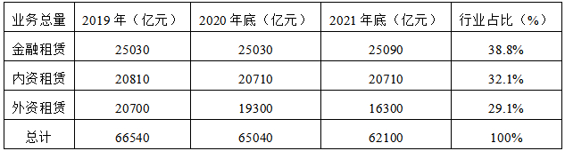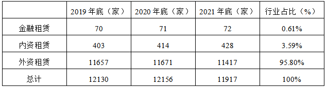 外资租赁公司:2021年全国的审批工作仍处于停滞状态,山东等地区部分企业正式退出市场。截至年底,全国外资企业总数约为11417家,比上年底减少约254家。租赁业是最早开放的金融业,而外资租赁注册门槛较低、审批方便,外加部分地区对其发放补贴予以政策支持,外资租赁公司得以租赁行业数量最庞大的群体。