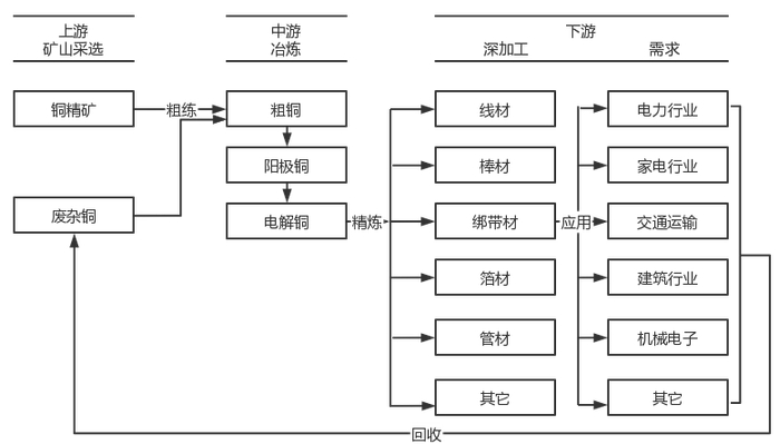 作为典型的有色金属,铜产业链分成三个阶段:上游是铜产业发展的源头,主要是铜矿石的勘探、采矿和分选,涉及到的设备如液压劈裂机、浮选机、重选机和干、湿磁选机等通选设备,铜矿资源的稀缺会制约铜产业的发展;中游是将铜精矿和废杂铜通过火法冶炼或湿法冶炼生产出纯度99%的精炼铜或纯度99.9%的电解铜(也称作阴极铜)的过程,涉及到的设备包括鼓风炉、卧式转炉、闪速炉、电炉等,精炼铜是铜产业链的核心,冶炼过程中还会生产出金、银、硫酸等副产品;下游为铜材深加工环节,将精炼铜加工成铜线、铜棒、铜管、铜板、铜箔和铜合金等铜材产品,涉及到的设备有数控机床、挤压机、弯管机等,下游铜材产品主要应用于电力、建筑、家电、交通、通讯等行业。铜产业链各环节示意图如图2-3所示。