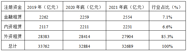 近三年来,我国租赁业处于调整状态,总计注册资金呈小幅下降趋势。截至2021年12月底,行业注册资金总计约32689亿元,较上年底的32884亿元减少195亿元,增长-0.6%。其中:金融租赁为2554亿元,同比增长13.1%;内资租赁为2231亿元,同比增长0.9%;外资租赁为27904亿元,行业占比约85.34%,同比下降-1.8%(见表1-3)。