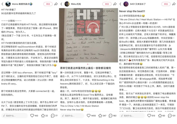 打开DJ国鹏在小红书上发布的、关于停播的笔记评论区,更像在翻阅一本青春回忆录。有一位IP地址在海外的网友分享道:他从上学到上班,再到结婚生子,后又因工作移民海外的这些年,整个青春都是听着Hit FM度过的。在停播那天,他忍不住哭了。