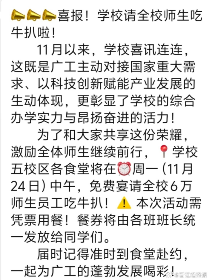 近日,广东工业大学在公众号上发文,因学校喜讯连连,学校决定请全校6万名师生吃牛扒。