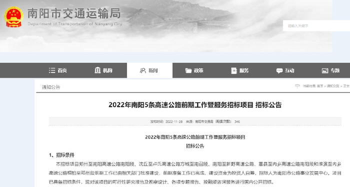 【大河财立方消息】12月1日消息,南阳市交通运输局近日发布5条高速公路前期工作暨服务招标项目招标公告,涉及郑州至南阳高速公路南阳段、沈丘至卢氏高速公路方城至南召段、南阳至新野高速公路、嵩县至内乡高速公路南阳段和淮滨至内乡高速公路桐柏至邓州段等5条高速公路项目。